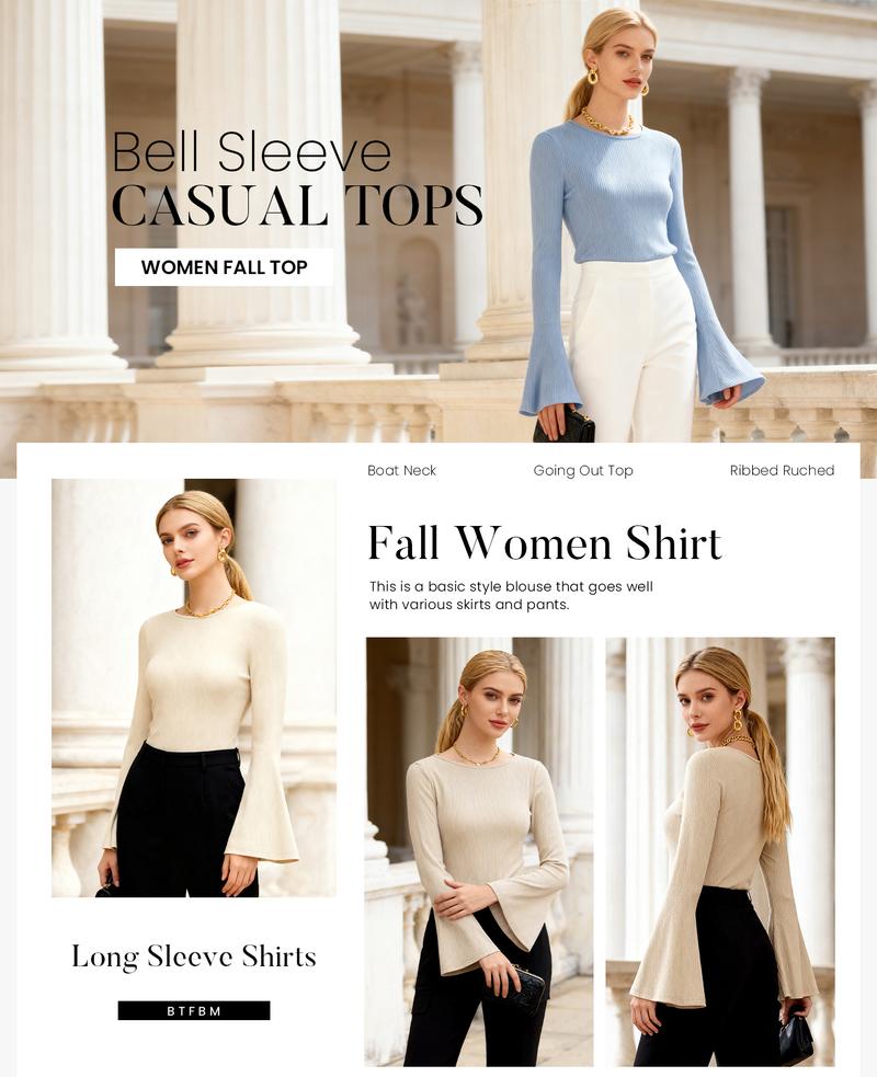 BTFBM Long Sleeve Shirts for Women 2025 Fall Y2K Clothes Casual Solid Color Boat Neck Bell Sleeve Fitted Going Out Tops